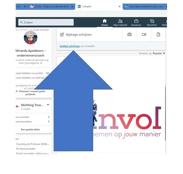 Heel eenvoudig: klik op “Artikel schrijven” in plaats van een Bijdrage te schrijven (Share an update).